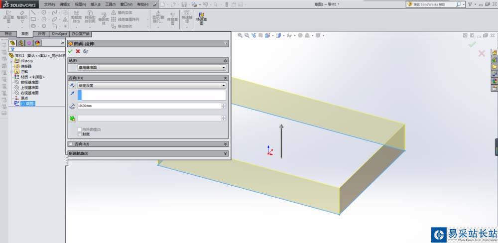 4、完成了截面草圖的繪制,在退出草圖之后,就轉到了“曲面-拉伸”對話框,在這里選擇拉伸方向、深度及是否拔模。完成設置之后,點擊左上角的√,就OK了。