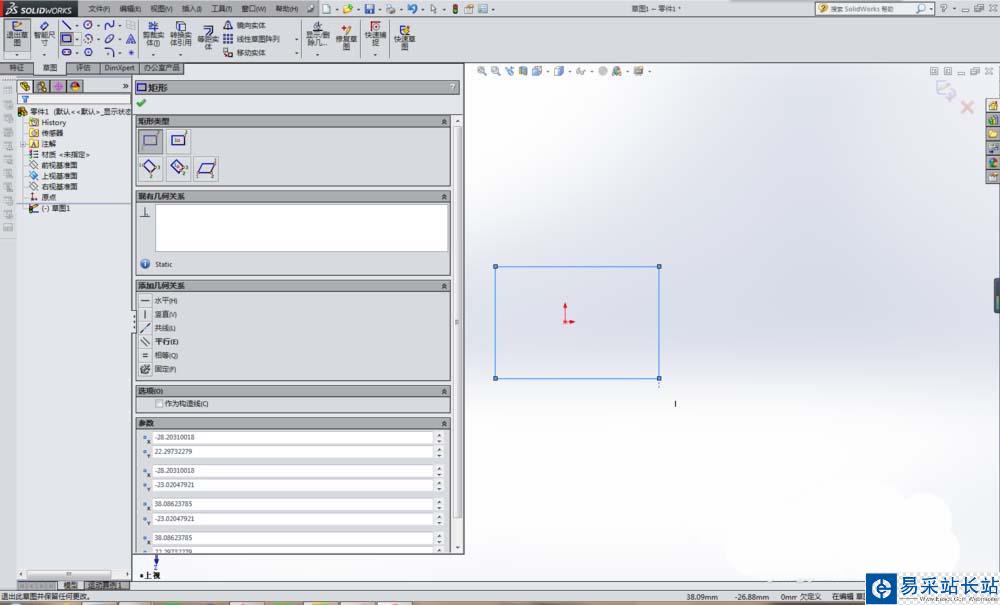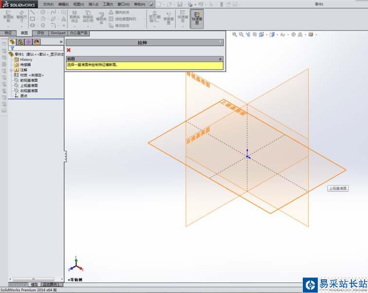 3、因為之前沒有畫截面草圖,所以,這里首要的是畫草圖,如下所示,先選擇上視基準面作為草圖平面,然后畫一個矩形,完成并退出草圖。