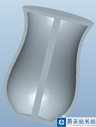 6、若第四步中選擇加厚10,并且將旋轉角度調整為180,則旋轉而成的實體如下所示,即每條邊均偏移了10mm形成了一個殼體。