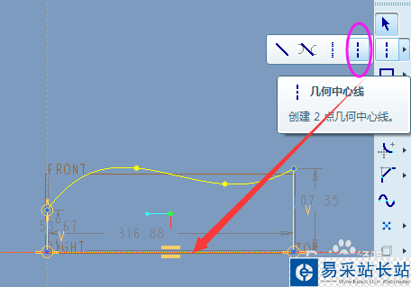 2、草繪一條幾何中心線作為旋轉軸,如下圖所示,點擊√或按鼠標中鍵完成并退出草繪。