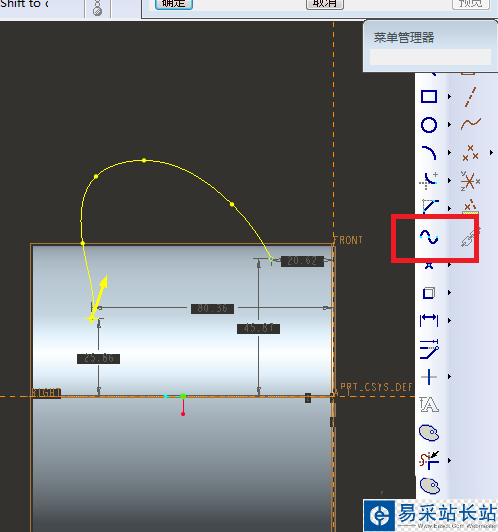 5、如下圖所示,進入到草繪環境,首先點擊工具欄中的“樣條曲線”,然后在草繪區域畫一個大概茶杯手柄的樣子,然后手動調整樣條曲線,使其更接近茶杯手柄,最后“√”完成并退出草繪。