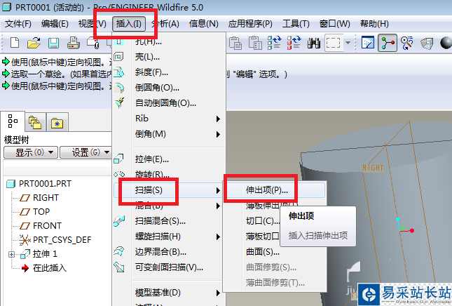 3、如下圖所示,執行【插入——掃描——伸出項】。