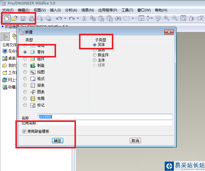 1、如下圖所示,打開Pro/e5.0軟件,新建一個空白的實體零件文件,記得使用缺省模板哦。