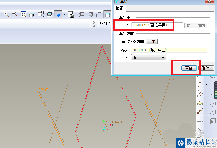 首先如下第一幅圖所示,執行【拉伸——放置——定義——FRONT面——草繪】。