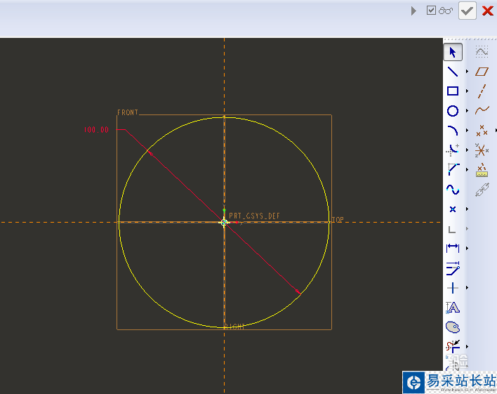 然后如下第二幅圖所示,進入到草繪環境,以坐標原點為圓心畫一個直徑100的圓,“√”完成并退出草繪。