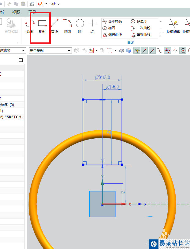 7、如下圖所示,點擊工具欄中 的 矩形圖標,激活矩形命令,然后隨手畫一個矩形,然后雙擊修改尺寸的標注,矩形的寬為12.0,矩形的右邊線距離縱軸6.0,點擊 完成。
