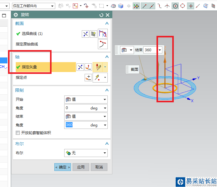 5、如下圖所示,回到旋轉(zhuǎn)對話框,點擊基準坐標系中的 Z軸為旋轉(zhuǎn)軸,看著預覽效果點擊 確定。