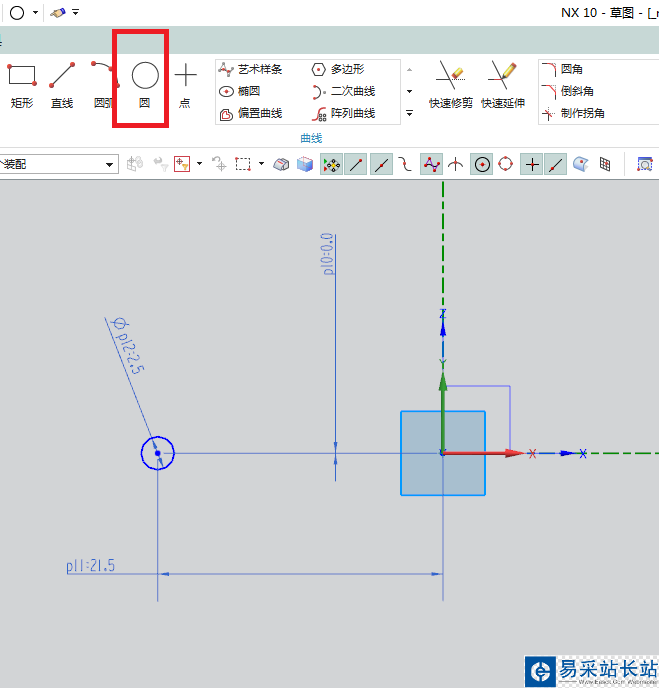 4、如下圖所示,成功進入草圖,激活圓命令,然后在縱軸的左邊隨手畫一個圓,然后雙擊修改圓的尺寸,圓的直徑為ø2.5,圓心距離橫軸的距離為0,距離縱軸的尺寸為21.5,然后點擊工具欄中 的 完成 圖標。