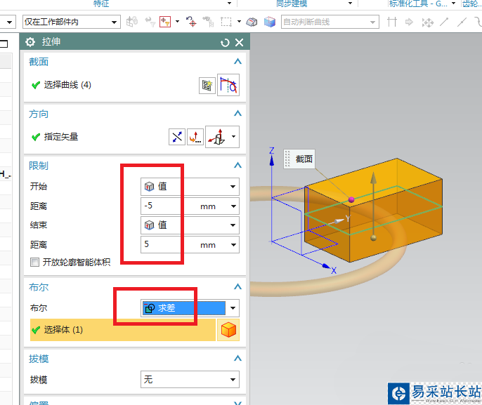 8、如下圖所示,回到拉伸對話框,兩邊設(shè)置限制,-5開始,5結(jié)束,布爾求差不能少,點擊確定。
