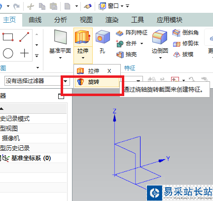 2、如下圖所示,在工具欄中找到隱藏在拉伸圖標下方的旋轉(zhuǎn)圖標,點擊它,激活旋轉(zhuǎn)命令。