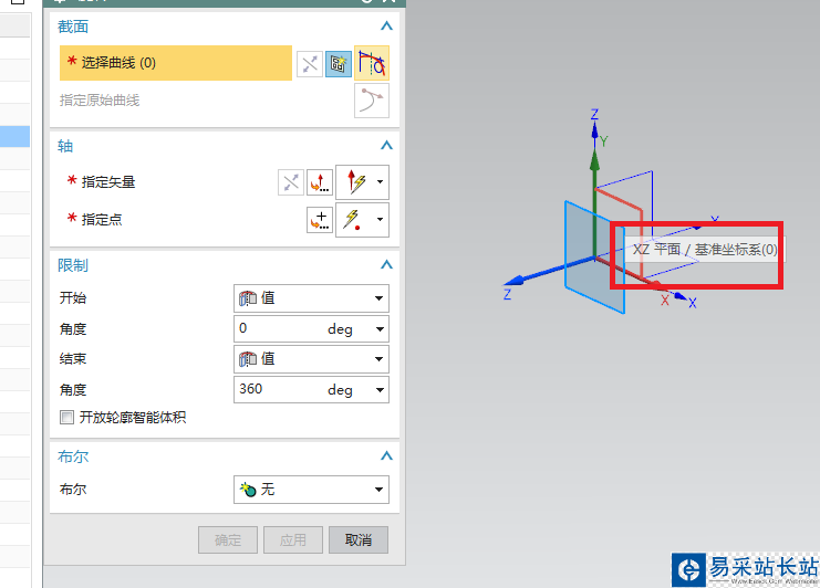 3、如下圖所示,出現(xiàn)旋轉(zhuǎn)對話框,點擊基準坐標系中的XZ平面,就能直接進入草圖了。