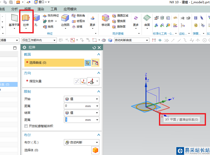 6、如下圖所示,點擊工具欄中的拉伸圖標,激活拉伸命令,然后點擊基準坐標系中的XY平面直接進入到草圖環(huán)境。