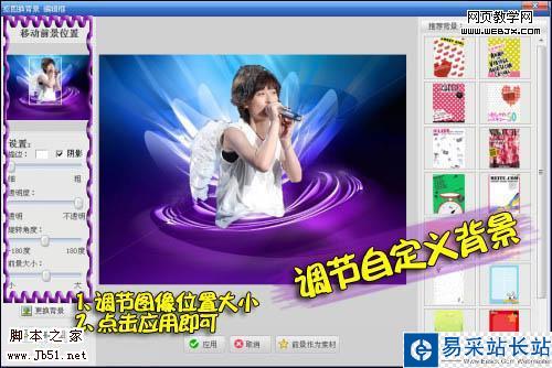 導入自定義背景哦,再調節人像位置和大小,就可以點擊應用,背景置換完畢,很簡單吧。