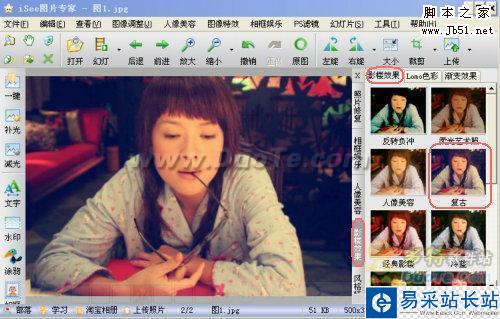 操作步驟:1.iSee打開圖1,點擊“右側工具欄”—影樓效果—復古。