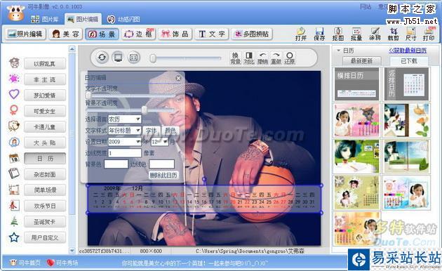 執行“場景→日歷”命令,筆者選擇了“橫排日歷”,如圖05所示。將日歷縮小到與照片同寬,并將其移動到照片的底部,可以調整背景和文字的不透明度。
