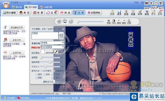 下面我們就可以為照片添加一些文字。執行“文字”命令,并點擊“添加靜態文字”按鈕,如圖06所示。在文本編輯框中輸入“艾弗森”,在網絡字體的下拉菜單中選擇“漢儀米米”,并勾選“豎直排列”選項,調整好字體的大小及位置。