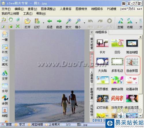 1.iSee軟件打開(kāi)圖2,選擇“右側(cè)工具條”—相框娛樂(lè)—自由拼圖。