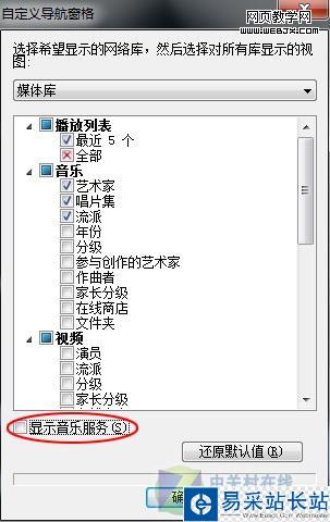 在彈出的窗口下方,取消程序默認勾選的“顯示音樂服務”(如圖3)后: