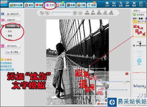 3、在文字模板中,選擇一個(gè)憂傷文字添加進(jìn)圖片。
