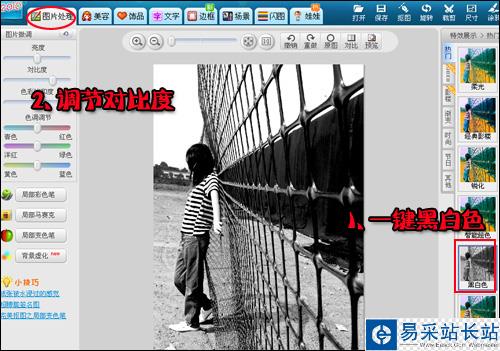 2、在“圖片處理”分類下,選擇“熱門”效果中的“黑白色”,再調(diào)節(jié)對(duì)比度就能打造很酷的黑白效果了。