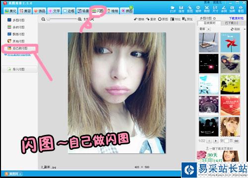 1、打開一張圖,進入美圖秀秀的“閃圖”菜單欄,選擇“自己做閃圖”功能(如下圖所示)。