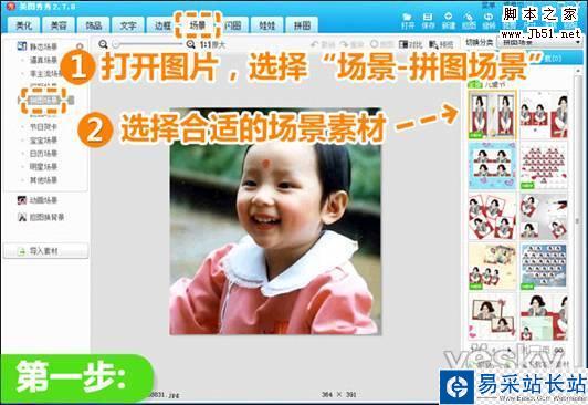 1.打開(kāi)原圖后,點(diǎn)擊“場(chǎng)景”菜單,選擇“拼圖場(chǎng)景”。挑選一個(gè)合適的素材后點(diǎn)擊下載。