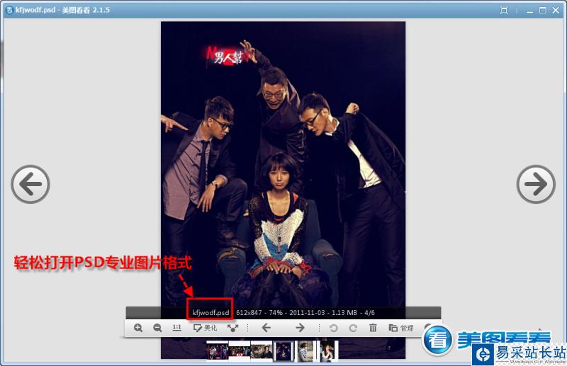 再在軟件的大圖瀏覽模式下來看看,如圖04所示,PSD這種專業圖片格式在軟件中均能流暢的打開,而且軟件同時也提供了比較豐富的看圖操作體驗,比如放大縮小、圖片分享到微博等等。特別是軟件高清大圖瀏覽快的特點,也很適合用來瀏覽像PSD這樣文件體積超大的專業圖片格式。