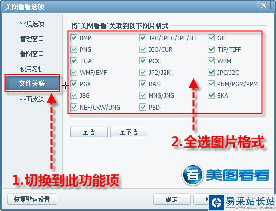我們進入第五項文件關聯頁面中即可進行對于圖片格式的設置(如圖03所示)。直接全選所有圖片格式,然后關閉美圖看看再重新打開,一切問題都是浮云!