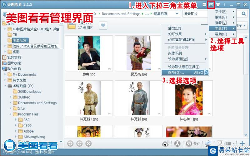 那么,如果偶爾發現在美圖看看中有些格式的圖片沒有預覽顯示,是怎么回事呢?你可以到軟件設置界面中查看一下,是否勾選了相應的文件關聯格式。詳細的設置過程如下:首先,我們進入美圖看看的管理頁面(如圖02所示)點擊進入右上方下拉三角(主菜單)中的工具-選項一欄中