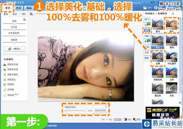 1、在“美圖秀秀”軟件下打開待處理的照片,進入“美化”菜單下,選擇“基礎”特效分類,分別使用透明度為100%的“去霧”特效和透明度為100%的“暖化”特效進行特效疊加。