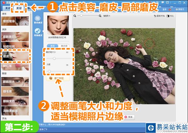 2. 進入“美容”菜單下,點擊“磨皮祛痘”,調節畫筆大小和力度涂抹照片,適當模糊照片邊緣部分。