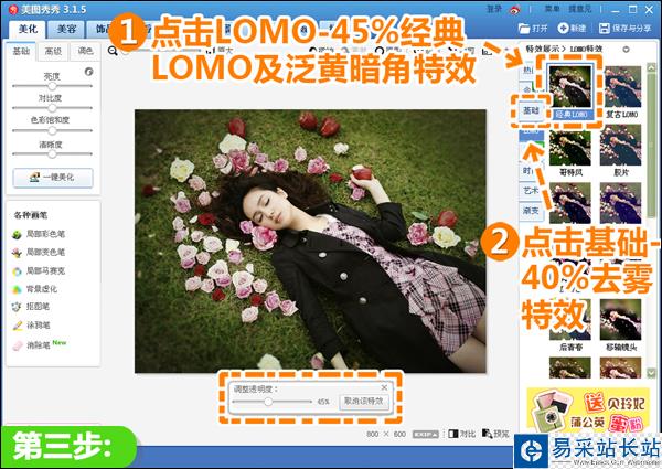 3. 返回“美化”菜單下,點擊“LOMO”分類選擇透明度為45%“經典LOMO”及“泛黃暗角”特效,再使用透明度為40%“基礎-去霧”特效。