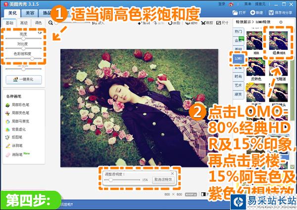 4. 再分別使用80%的“LOMO-經典HDR”、15%“印象”特效及15%的“影樓-阿寶色”、100%“紫色幻想”特效,并適當調高色彩飽和度。