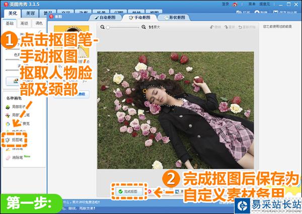 1. 在“美圖秀秀”下打開待處理的照片,點擊“摳圖筆-手動摳圖”摳取人物臉部及頸部,并將摳圖部分作為素材保存為“飾品-用戶自定義”備用。