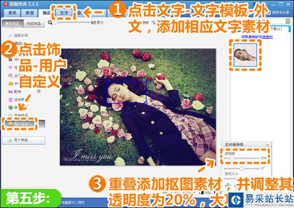 5. 最后進入“文字”菜單下點擊“文字模板-外文”添加文字素材,再進入“飾品-用戶自定義”中重疊添加摳圖素材,并調整其透明度為20%,適當修復臉部曝光過度的問題即可。