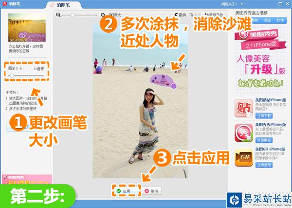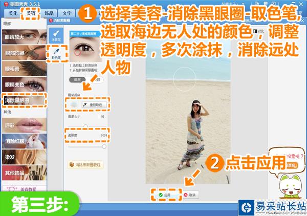 3、然后,我們選擇消除黑眼圈中的取色筆選項,選取海邊無人處的顏色,設置畫筆透明度,逐步消除海邊遠處的路人。取色筆不僅可以快速消除路人,還能保證背景不變。待路人全部消除后點擊“應用”。