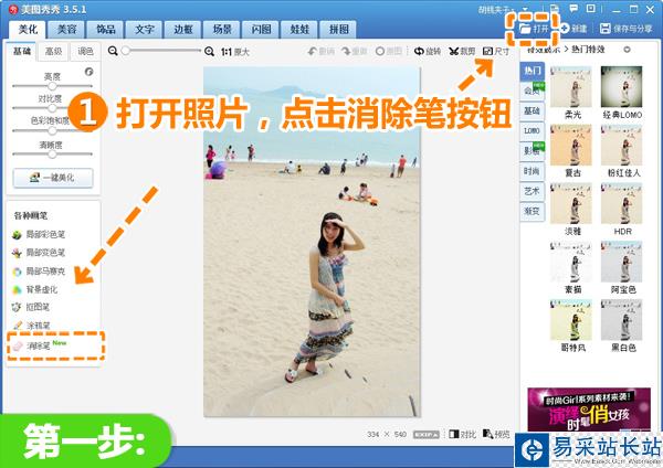 1、在“美圖秀秀”中打開一張待處理的照片,點擊“美化-消除筆”。