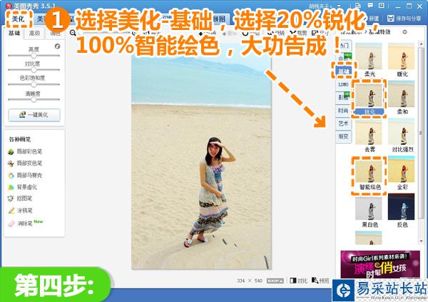 4、最后,仍在“美化”菜單下點擊“基礎”分類,選擇透明度為20%的“銳化”特效和100%的“智能繪色”特效,來改善圖片整體效果。這樣就大功告成啦!