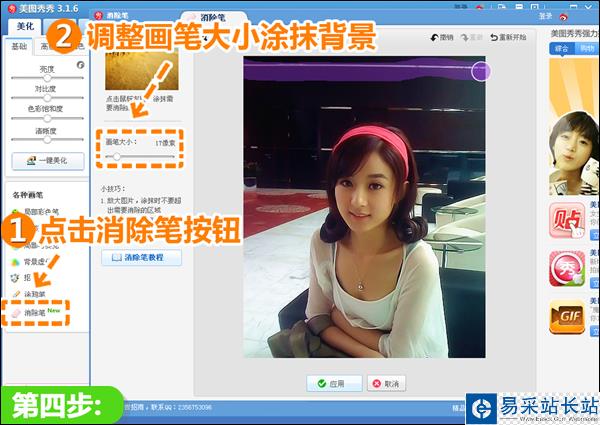 4、依舊在“美化”菜單下,點擊“消除筆”按鈕,適當調整消除筆的畫筆大小,涂抹掉背景中的多余部分。