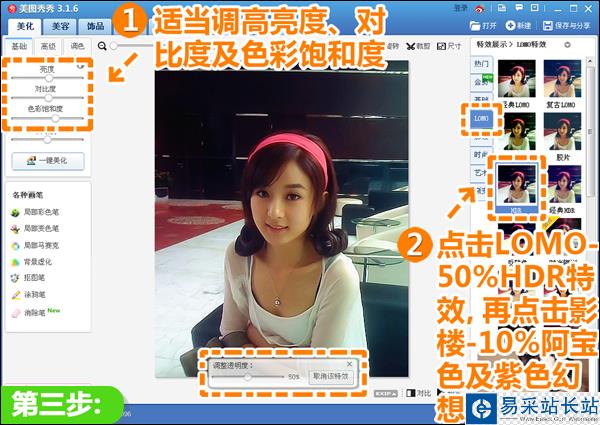 3、然后分別使用“LOMO”分類下透明度為50%的“HDR”特效,還有“影樓”分類下透明度為10%“阿寶色”及“紫色幻想”特效;再適當調高照片亮度、對比度及色彩飽和度。