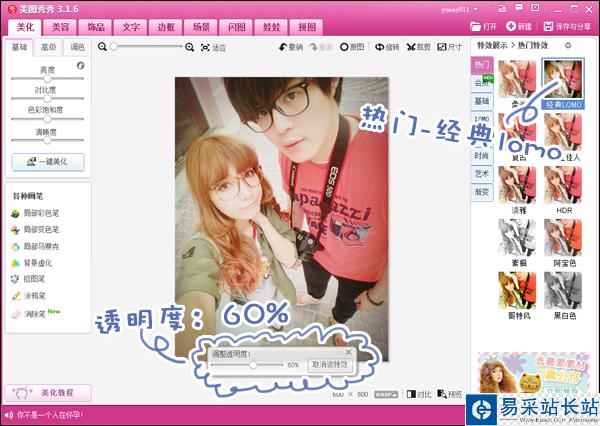 2、接著是選擇透明度為60%“熱門—經(jīng)典LOMO”特效。
