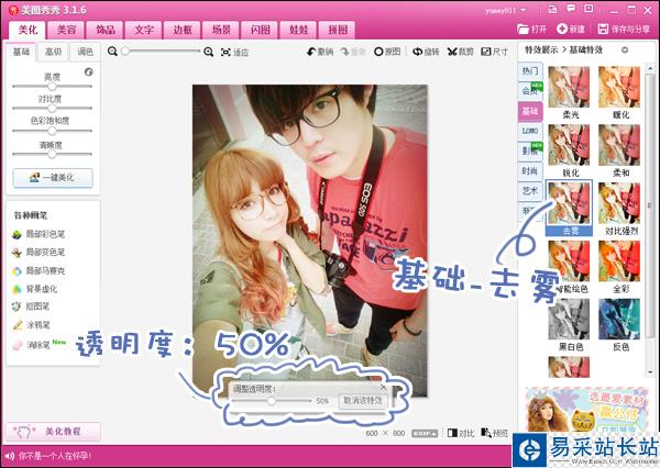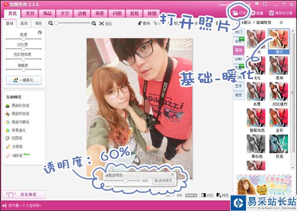 1、在“美圖秀秀”中打開一張情侶合影,在“美化”菜單下,選擇一些特效來調(diào)節(jié)照片色調(diào)。先選擇“基礎(chǔ)—暖化”特效,并將透明度調(diào)至60%。