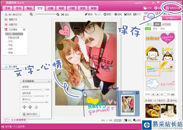 6、最后,進(jìn)入“文字”菜單下,在“文字模板—心情”分類中,選擇一個(gè)貼合畫面內(nèi)容的文字素材,就大功告成啦!