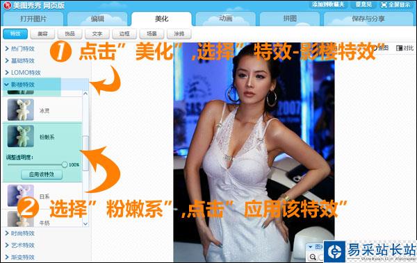 2.點擊“美化”,選擇“特效”里的“影樓特效”,選擇“粉嫩系”特效,并點擊“應用該特效”,使皮膚粉嫩。