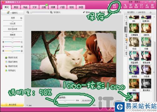 第三步:最后使用一次“LOMO-炫彩LOMO”,將透明度調(diào)整為50%,突出人物面部,點(diǎn)擊保存,就完成啦!