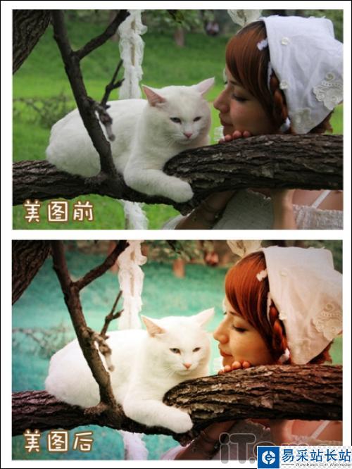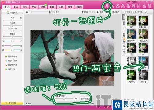 第一步:在“美圖秀秀”軟件中打開(kāi)原圖,進(jìn)入“美化”菜單,使用“熱門(mén)-阿寶色”特效,將透明度調(diào)節(jié)為50%,使背后的草地背景變成藍(lán)綠色調(diào)。