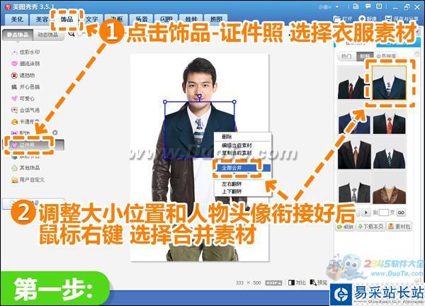1、在“美圖秀秀”下打開一張待處理的正面生活照,進(jìn)入“飾品”菜單下,在“證件照”分類中選擇適合自己的衣服素材,調(diào)節(jié)大小位置和人物銜接好后右鍵合并素材。