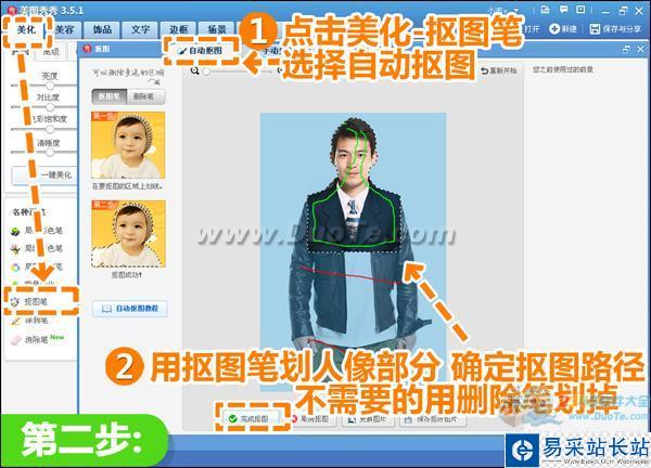 2、接著進(jìn)入“美化”菜單下,點(diǎn)擊“摳圖筆”選擇“自動(dòng)摳圖”,用摳圖筆在人像部分劃綠線確定摳圖路徑,不需要的部分用刪除筆劃掉,然后點(diǎn)擊“完成摳圖”。