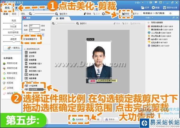 5、最后點(diǎn)擊“美化—剪裁”,先選擇證件照比例(有1寸和2寸常用尺寸),再勾選鎖定剪裁尺寸下拖動(dòng)選框確定剪裁范圍后,點(diǎn)擊“完成剪裁”就大功告成啦!