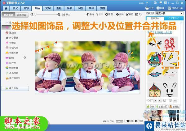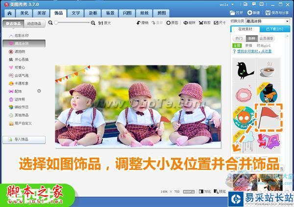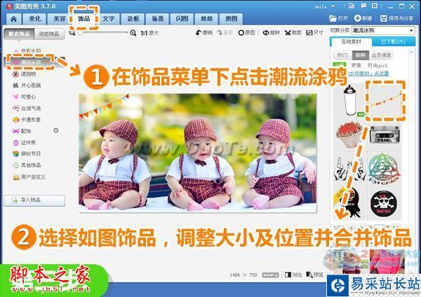 3、接下來進入“飾品”菜單下點擊“潮流涂鴉”分類,選擇一些素材進行裝飾,調整大小及位置并合并飾品素材。